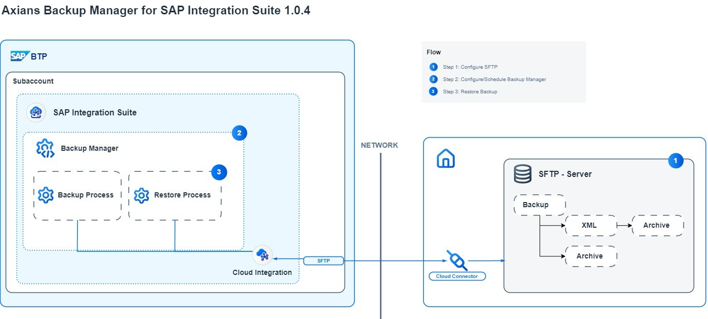The SAP Integration Suite Backup Tool automatically and regularly backs up all artifacts within the SAP Integration Suite on SAP Business Technology Platform (SAP BTP), ensuring data security, compliance, and system reliability. One-click restoration enables fast recovery, minimal downtime, and uniterrupted business operations.